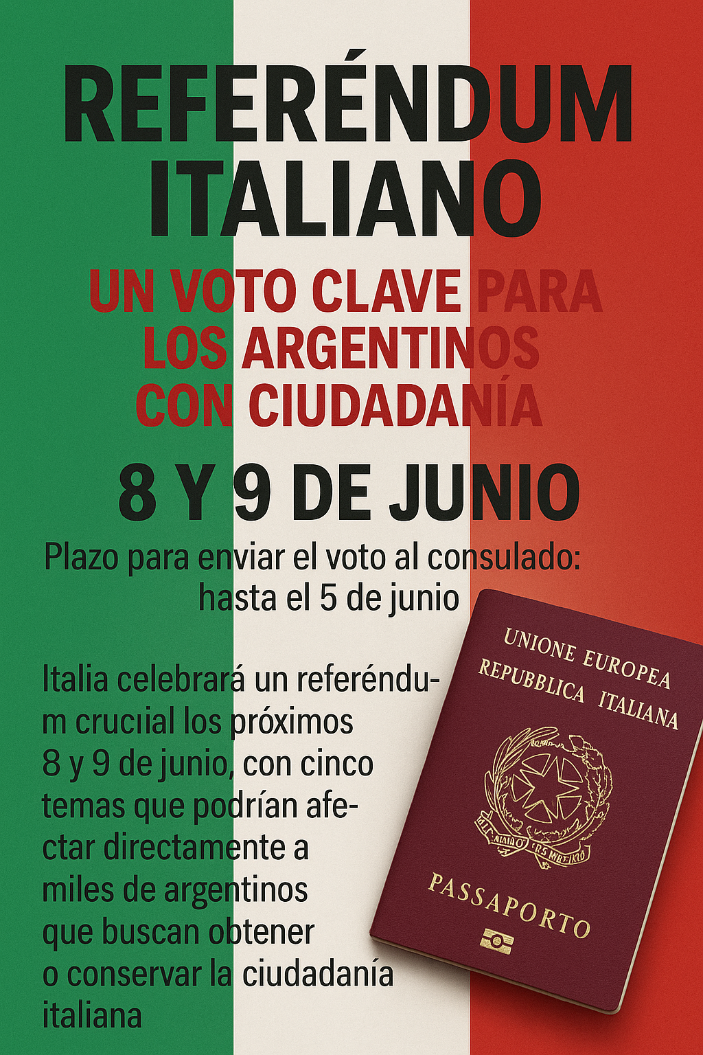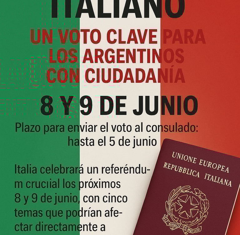 Italia celebrará un referéndum crucial los próximos 8 y 9 de junio, con cinco temas que podrían afectar directamente a miles de argentinos que buscan obtener o conservar la ciudadanía italiana (8 y 9 de junio – Plazo para enviar el voto al consulado: hasta el 5 de junio).